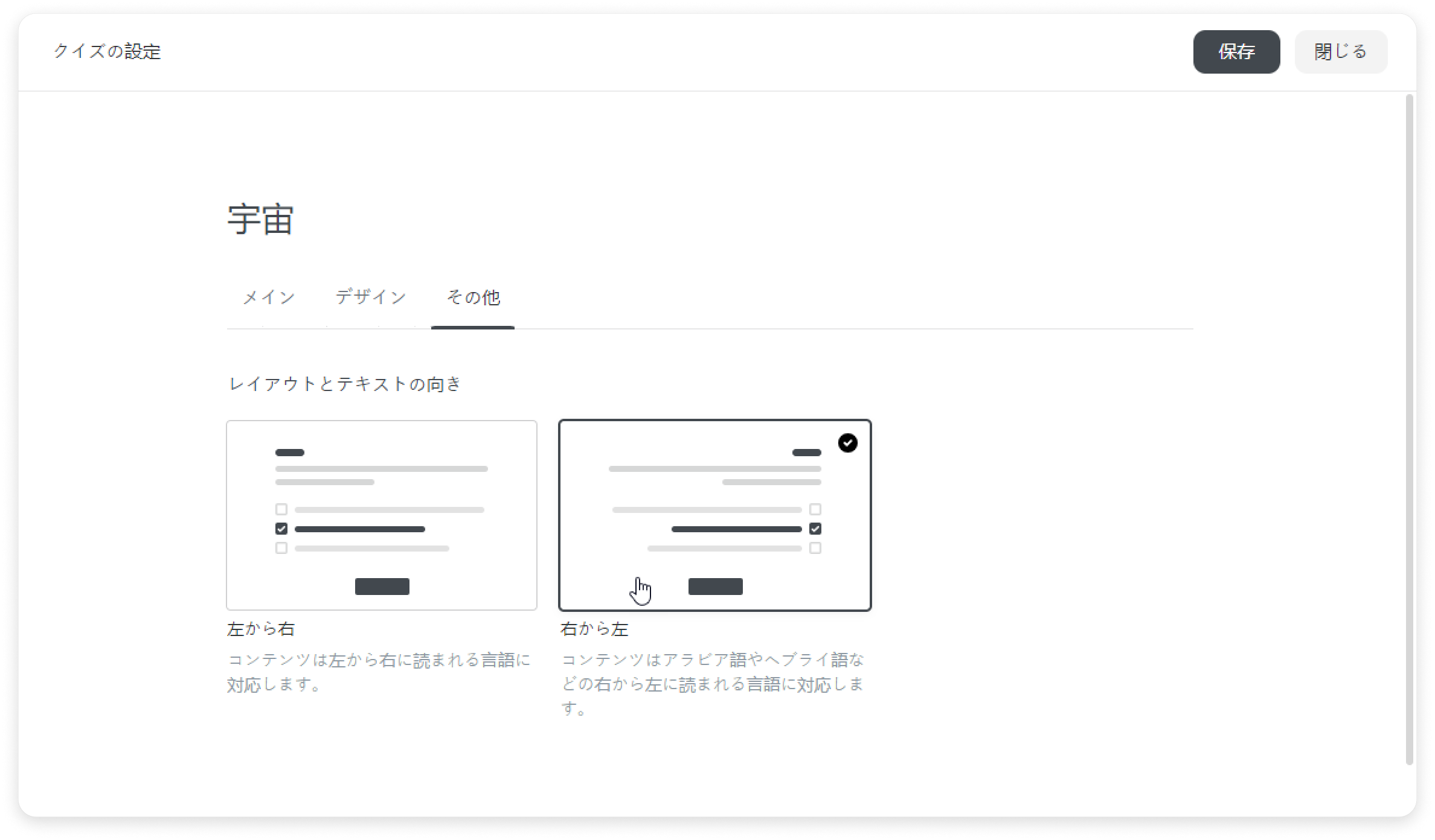 iSpring Cloud 教材 クイズの作成 クイズの設定 Current: レイアウトとテキストの方向 レイアウトとテキストの方向 アラビア語、ヘブライ語、ペルシャ語、ウルドゥー語、シンド語など多数の言語では、人々は右から左に向かうレイアウトを読んで使用します。オンラインクイズ設定で、レイアウトとテキストの方向を選択できるようになりました。ページ設定でレイアウトとテキストの方向を選択します。このプロセスを示すために、アラビア語でオンラインクイズを作成して、右から左の方向を選択しましょう。設定に移動しますそれから、その他 タブのところで、右から左方向を選択します保存を変更しますはい、できました。これで、コンテンツを共有する必要があるだけです。 ×