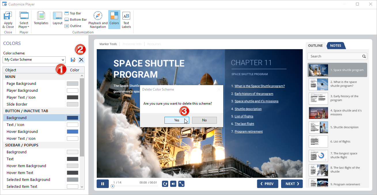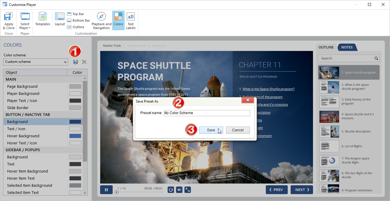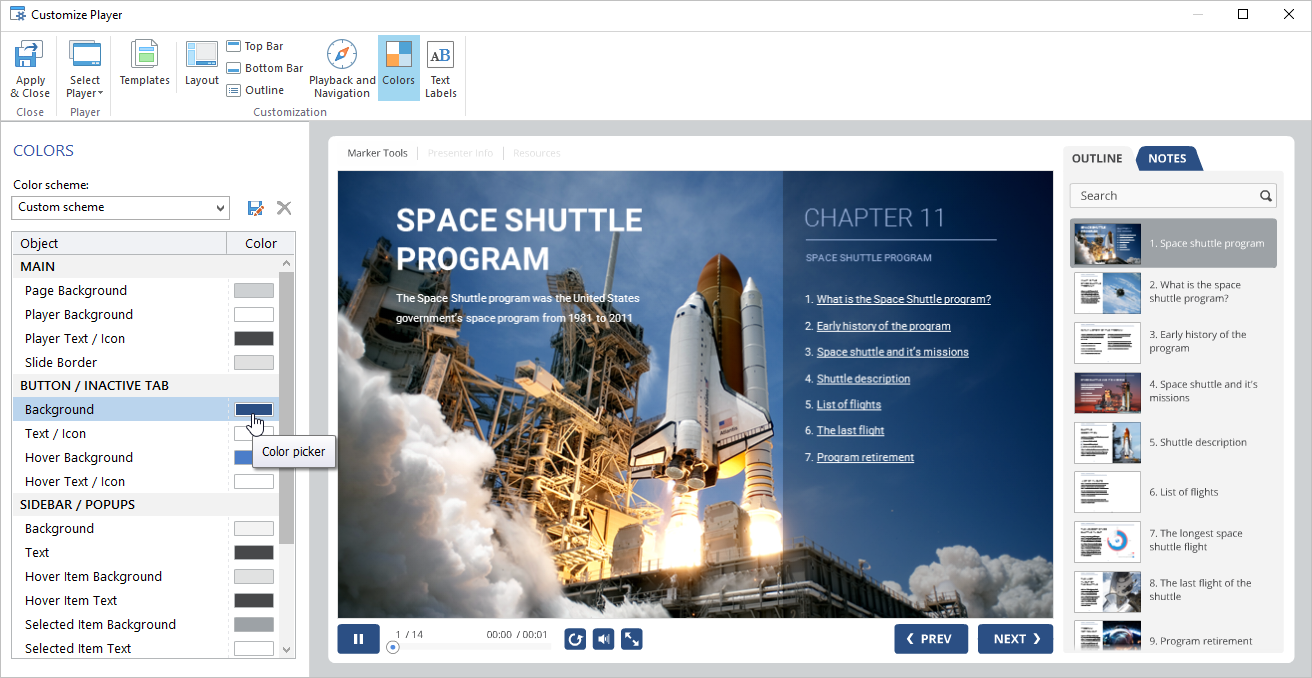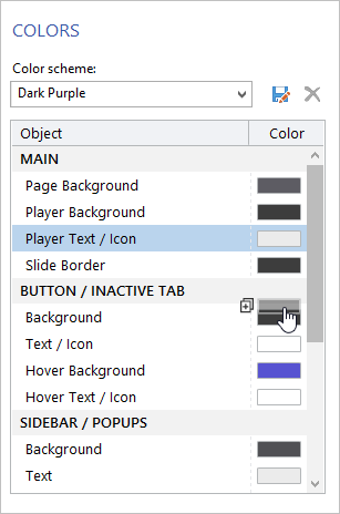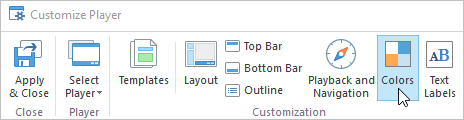 The player allows customizing colors of all its elements and saving them as a custom preset. To change a color of any element of the Universal player: