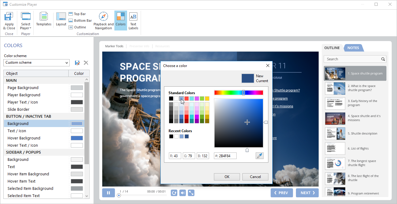 You can customize the color of the player elements to make it look in the same stylistic fit with the presentation or corporate colors of the organization.