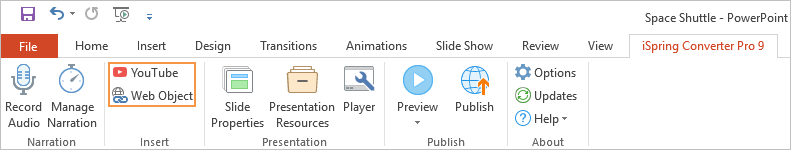 iSpring Converter Pro 9 Current: Enhancing Presentation Enhancing Presentation iSpring Converter Pro allows you to enhance your presentation with YouTube videos and web objects. In the Insert section, the following actions are available: ×