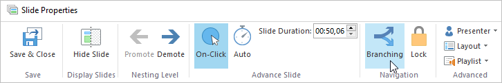 With the Branching option, you can specify a path for the user to advance through the presentation. That is, set the order the slides will be displayed, regardless of their position in the presentation.
