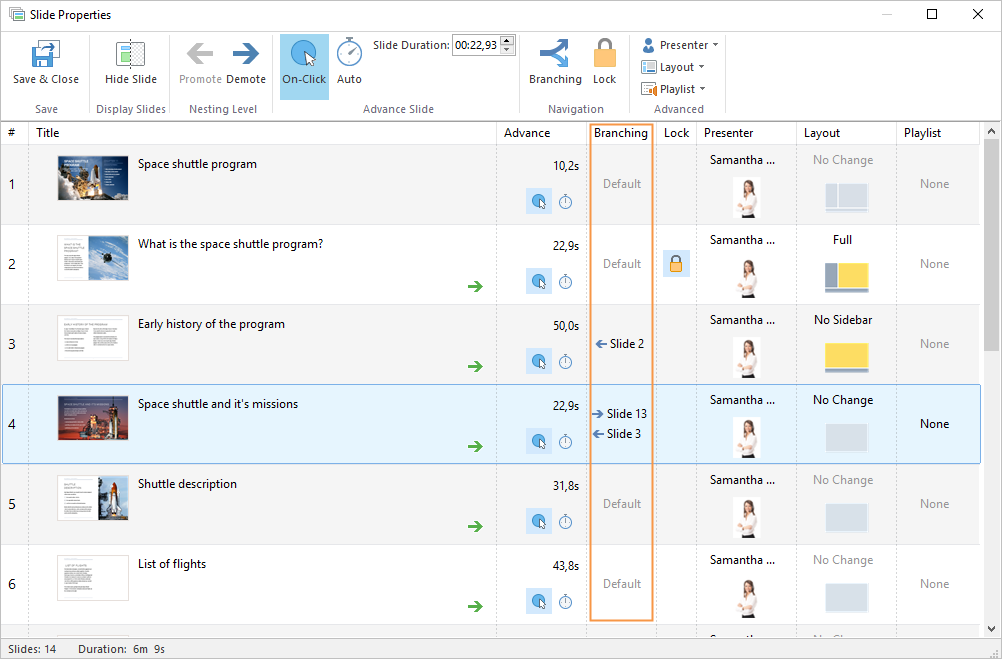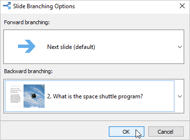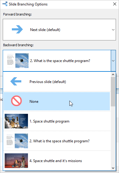 The configured branching preferences will be displayed in the Branching column. The following branching settings will be used by default: next slide for forward branching and previous slide for backward branching.