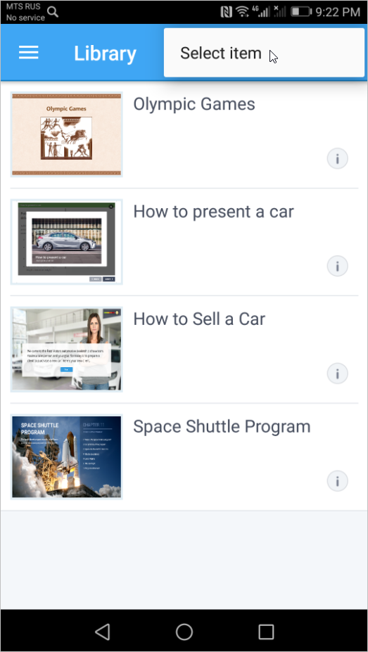 - The presentation and other content items which were earlier opened with iSpring Play can be found in the Library section. To start managing the presentation, tap the ⓘ symbol next to the presentation thumbnail.
