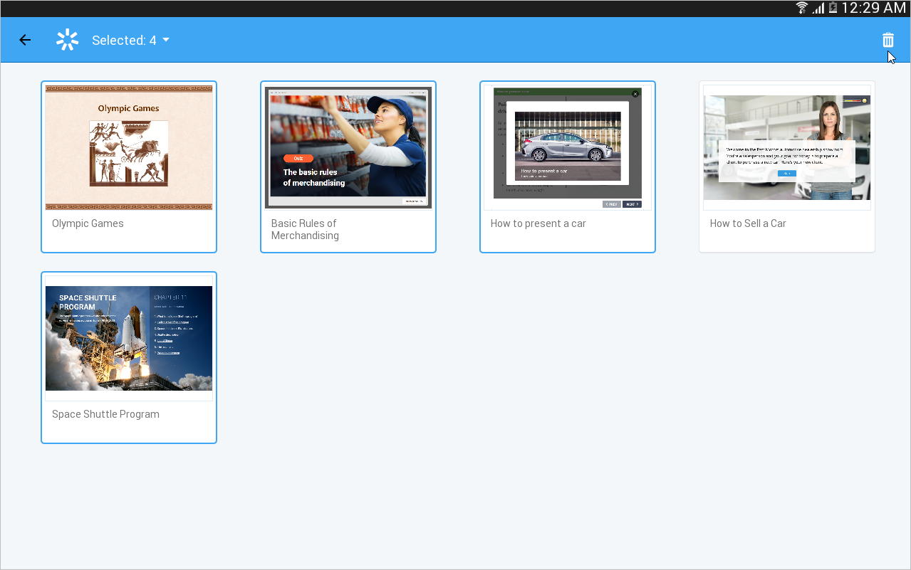 Choose the items you want to remove and tap the trash icon at the top right corner. The materials will be deleted from iSpring Play.