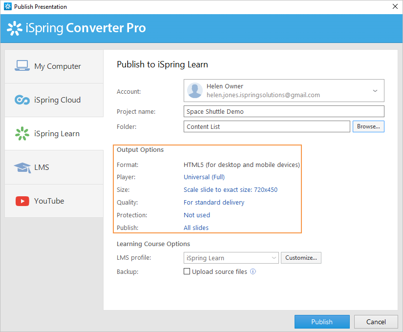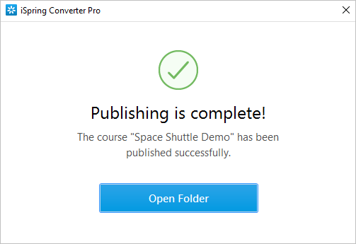 iSpring Converter Pro creates a package ready for uploading to the iSpring Learn service. Now you can log into your iSpring Learn account and upload this package at any convenient time. To learn more, read the detailed instructions for uploading courses to iSpring Learn via the web interface.