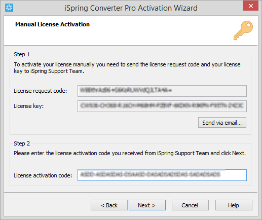 After you receive the License activation code from the iSpring Support Team, paste it into the corresponding field and click Next. Manual activation requests are usually processed within one business day.