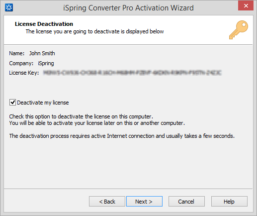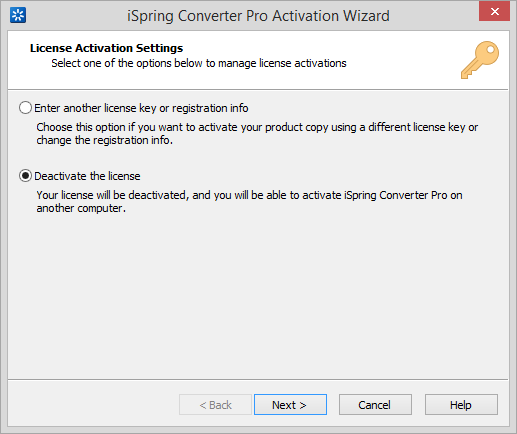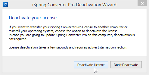 If you want to move iSpring Converter Pro to another computer or reinstall the operating system on your PC, you need to deactivate the license. You can either deactivate a license without removing the software from your computer or uninstall and deactivate your iSpring Converter Pro .