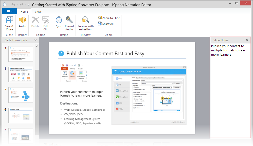 When you open the narration editor, slide notes are dispalyed in the right part of the screen. You can edit them right in the Slide Notes pane.