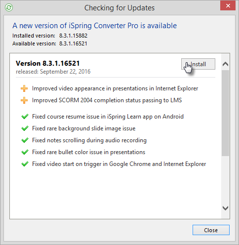 Any updates available after your Maintenance Plan expires are available on a trial basis. If your Maintenance has expired, you will see a notification window. Just click Renew Maintanance on the toolbar to renew your subscription and use the latest version of iSpring Converter Pro.