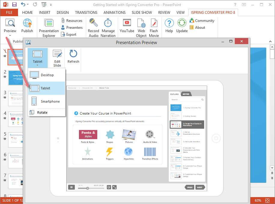 iSpring Converter Pro 8 has been improved significantly, now featuring enhanced narration editing capabilities and ability to send your presentations to iSpring Cloud sharing service.