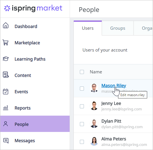- In the People section, open the Users tab and select the user you want to run a report on.