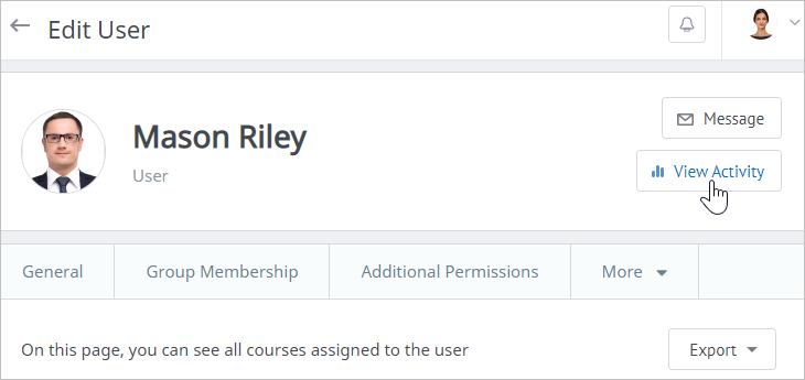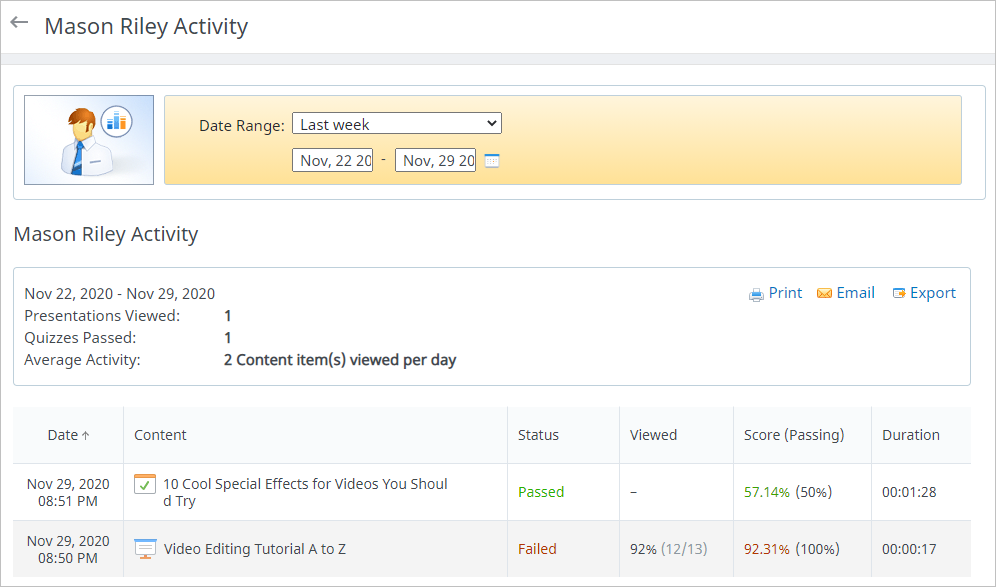 With the Activity report, you can find out which courses a user is currently taking, how they are progressing through them, what scores they earned, and how long they have been taking a particular course.