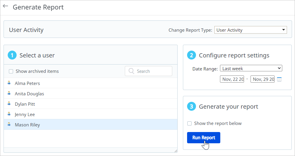 - On the newly opened Generate Report page, select the time range for the report, specify if you want the archived items to be shown and if the report should be opened on the same page. Then, click Run Report.