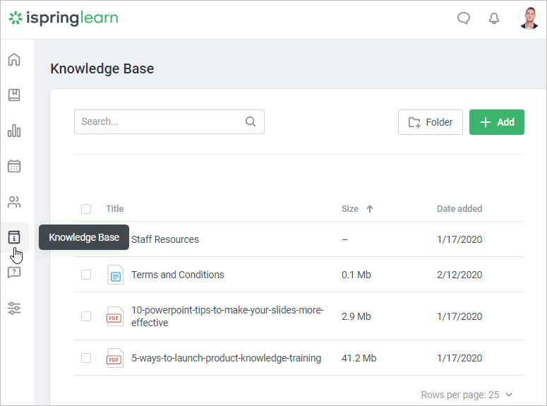 - The Knowledge Base section has appeared both in the admin panel and in the user portal. Now, proceed to fill it out with content — create folders, add links to videos and useful articles, and upload items from your computer.