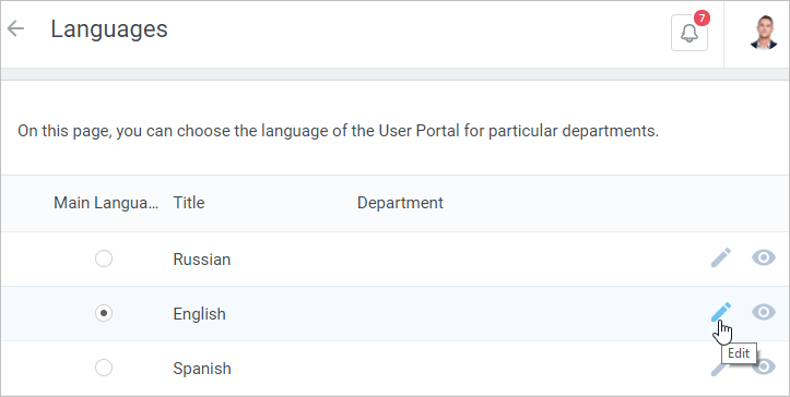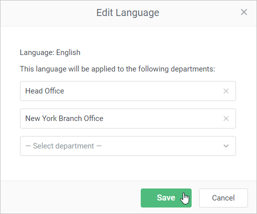 - In the Edit Language window, select a department or multiple departments that will see the User Portal in the selected language.