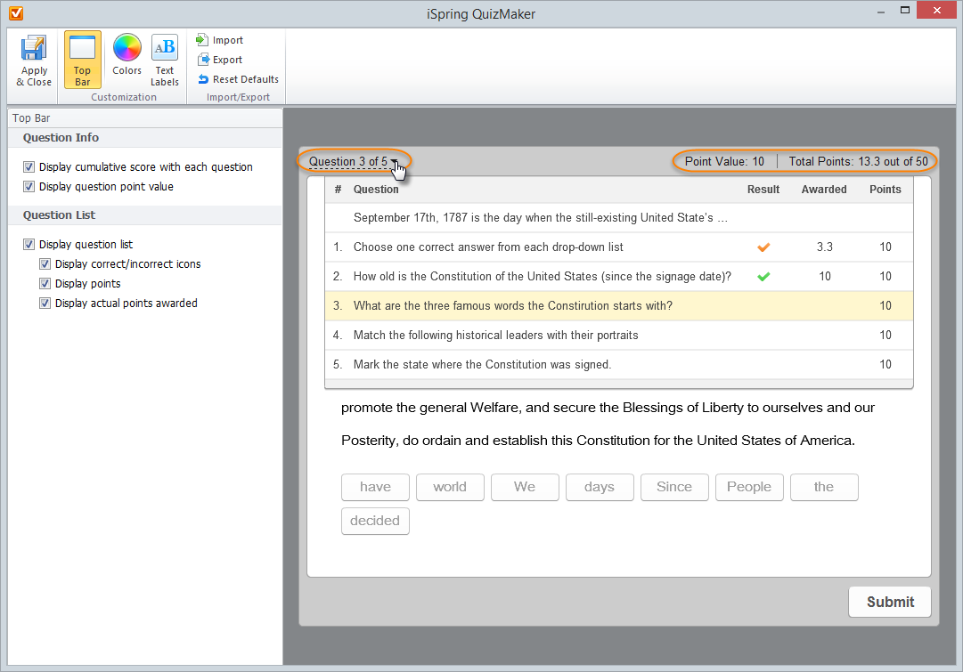 To customize the top bar elements of the quiz player, click the Top Bar button on the toolbar.