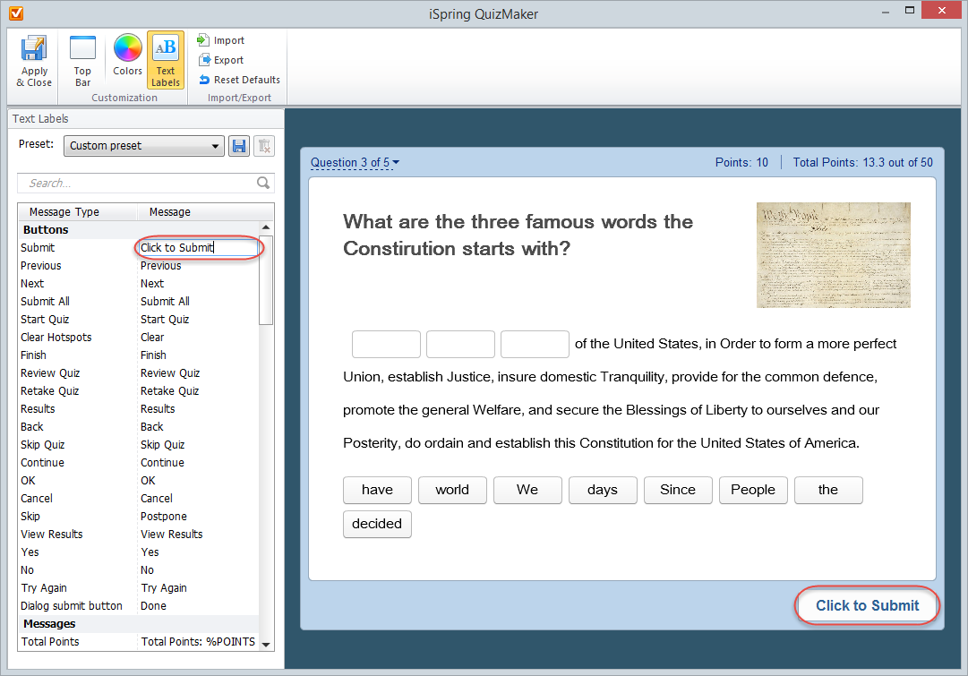 You can easily modify every button label and message in your quiz. This is particularly useful when targeting multiple languages. All messages are seperated into two parts: Button labels and Messages.