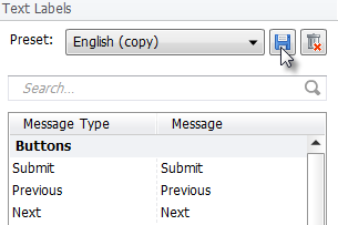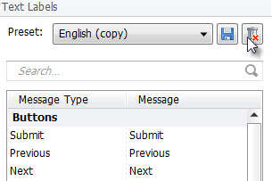 To find a message you want to change, use the search option. Start typing a search label or a phrase in the search box. Search results will appear in the table below instantly as you type. To remove your search criteria text, click the Clear button.