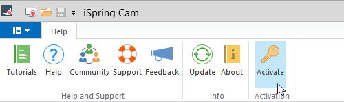 - In the Help tab of the product toolbar click the Activate button to launch the iSpring Cam Activation Wizard.