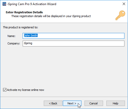 If you already have an iSpring Cam license, enter your license key and click Next to proceed with entering Registration Details. To purchase the iSpring Cam license, click Purchase Online.