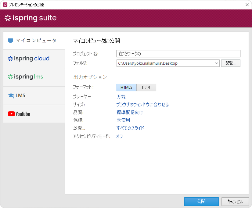 - iSpring Suite ツールバーで 「公開」ボタンをクリックします。