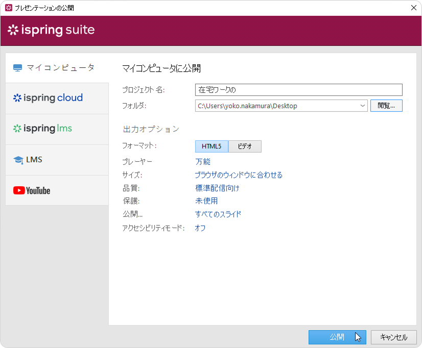 - 「マイコンピュータ」タブを選択して、プレゼンテーション名を入力し、設定を指定します。「公開」をクリックしす。