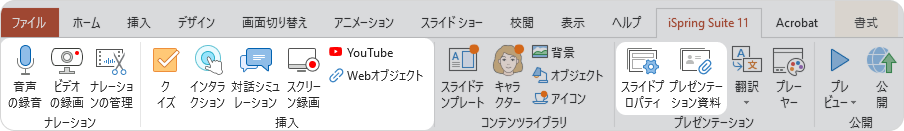 iSpring Suiteは、PowerPointベースの作成ツールです。ナレーションやインタラクティブな要素でPowerPointプレゼンテーションを強化し、オンラインで公開できるようにします。 PPTXファイルを開いてiSpring Suiteタブに切り替えるたびに、それはiSpring Suiteプロジェクトになります。