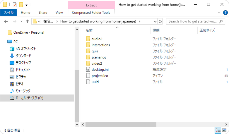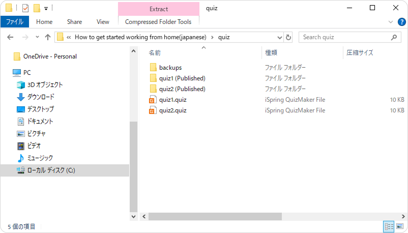 これは、このフォルダ内でiSpring Suiteプロジェクトのコンテンツがどのように整理されているのかを示しています。