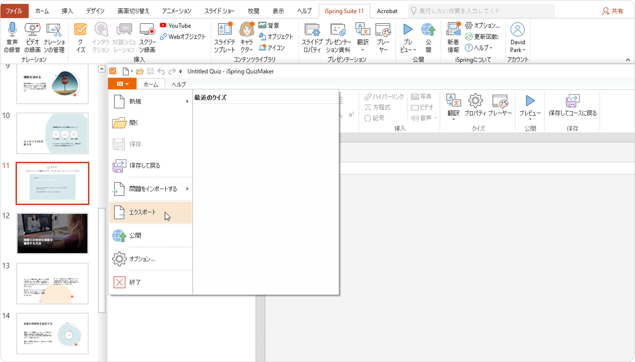 プロジェクトをエクスポートするには、ファイル > 共有 > iSpring Suiteプロジェクトの共有 > プロジェクトをエクスポート > エクスポートをクリックします。 詳細な指示を取得するには、プロジェクトのエクスポートに関する記事をお読みください。