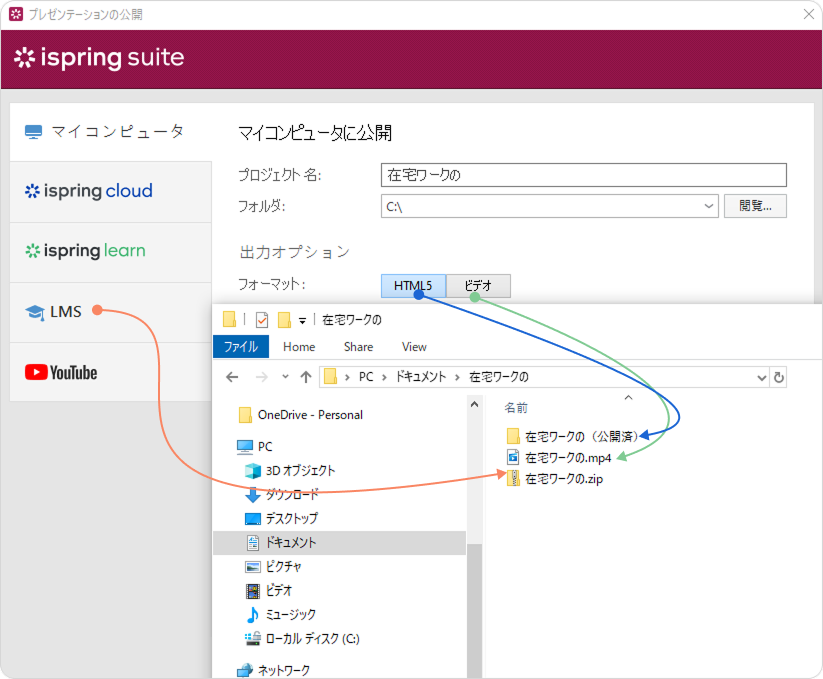 iSpring Suiteでのプロジェクトは、元のPowerPointプレゼンテーションと、それぞれのプロジェクトファイル(ナレーションやクイズなど)を保存するプロジェクトフォルダを組み合わせたものです。iSpring Suiteは、iSpringを用いて何かを追加する際にこのフォルダを作成し、PPTXファイルと同じ名前を付けます。