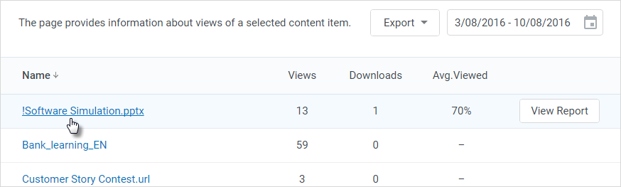 You can check the total number of views and downloads of a content item. This report can be used for tracking the time viewers spent on a given media file.
