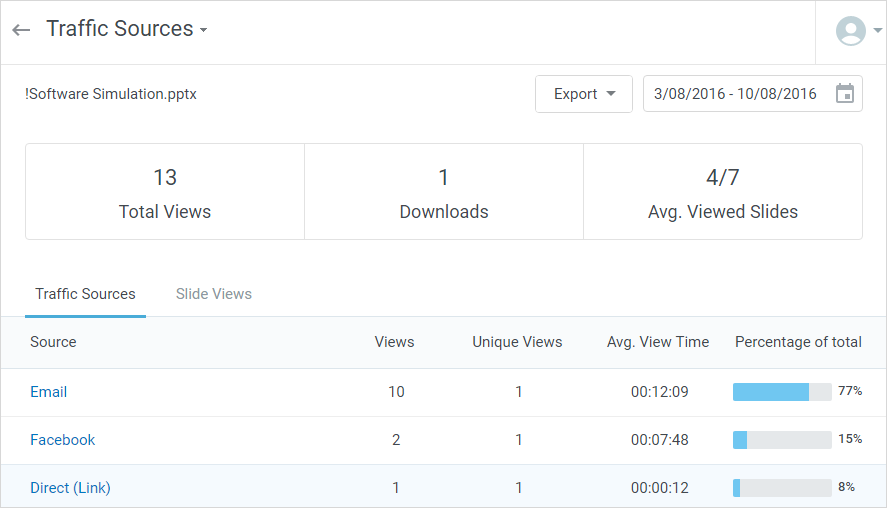 You can dig even deeper. If you are viewing the report for a presentation, you can open the detailed stats for each slide in it. Click on the source title to see the list of slides in the selected presentation, their titles, the number of views (total and unique), the average time spent for each slide, and percentage of total.