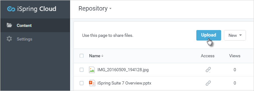 Next, you can proceed to uploading content to your iSpring Cloud account.