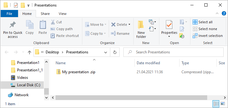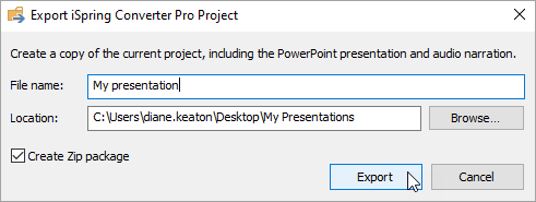 - In the opened window, specify the destination folder on your computer. Select the Create Zip package option if you want to archive your iSpring project.