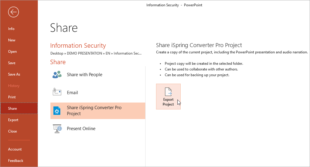 - Then, click on the Share button and select Share iSpring Converter Pro 10 Project.