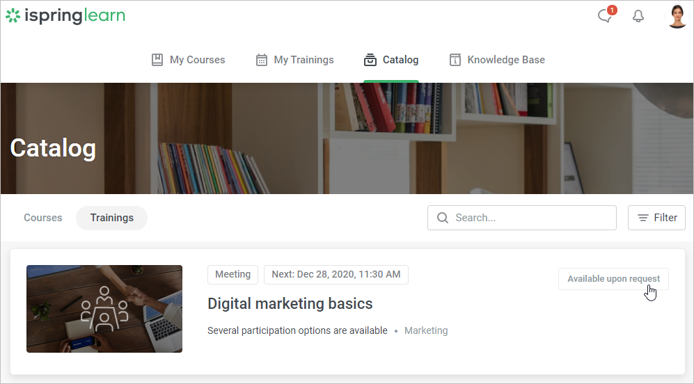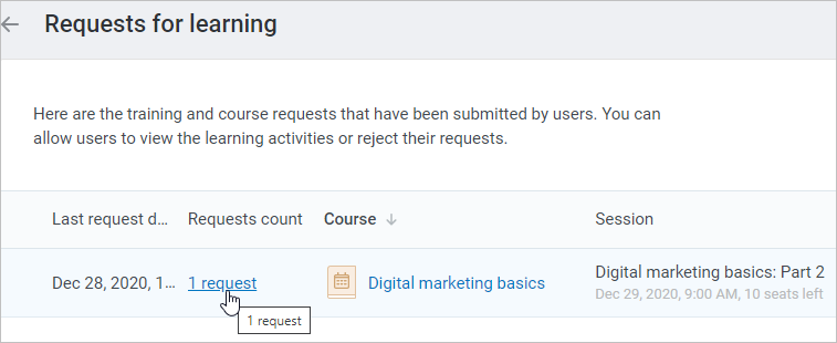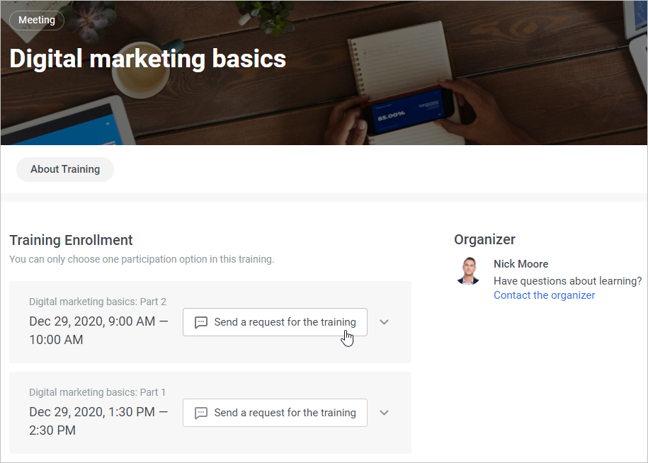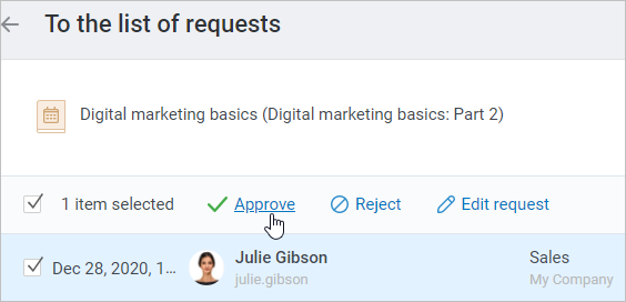 The user will receive a notification about the request being approved and an alert about the date and time of the session they've been enrolled in, both in the account and by email.