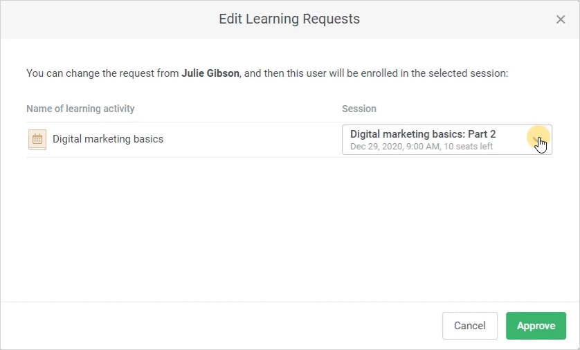 You can enroll a user in another session. Select a new session on the menu and click Approve.