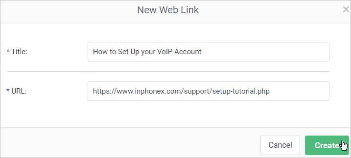 - In the New Web Link window, enter the title of the content item (this will be seen by your users) and insert the link into the URL field. After that, click the Create button.