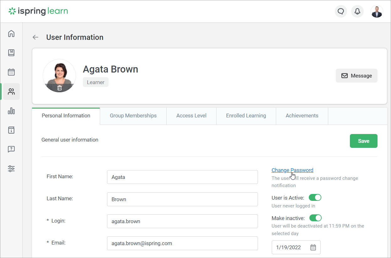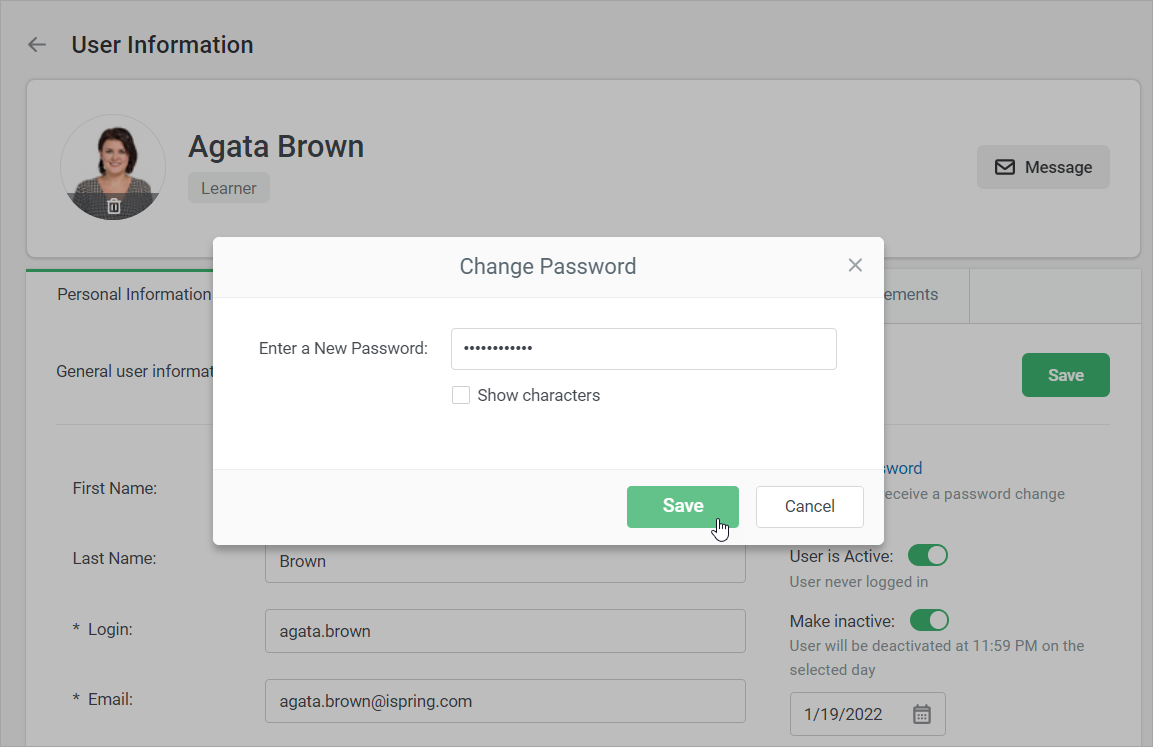 iSpring Learn Users Managing Users Editing Users Current: Changing Password Changing Password To change a user's password:Click the user's name in the Users section.Then, click the Change Password link.Enter a new password into the text field and click Save. You can enable and disable using strong passwords in the Settings section. ×
