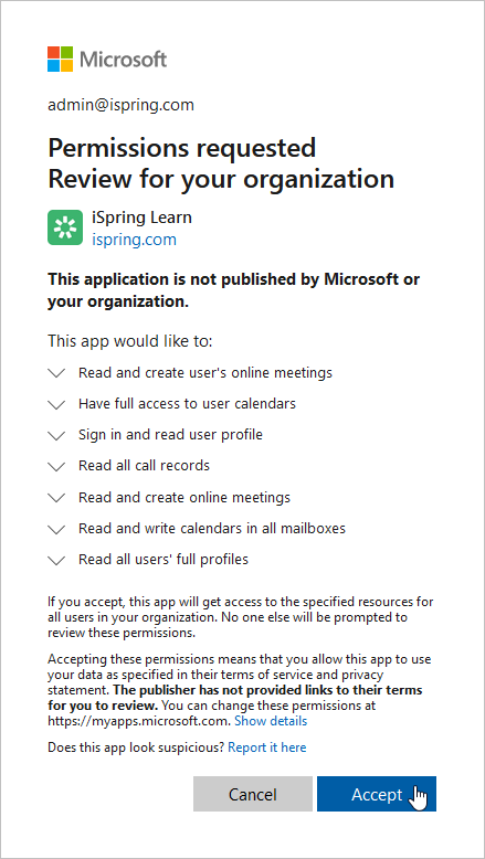 After they log in, the admin needs to allow the iSpring Learn app access to the Microsoft Azure AD account. To do this, they need to click Accept.