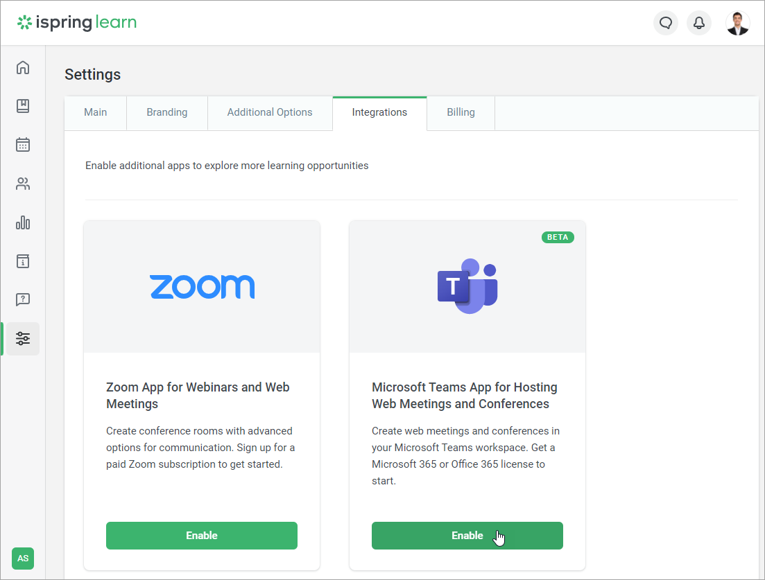 - Only Account Owner and Account Administrators can enable Microsoft Teams meetings in the iSpring Learn account.
