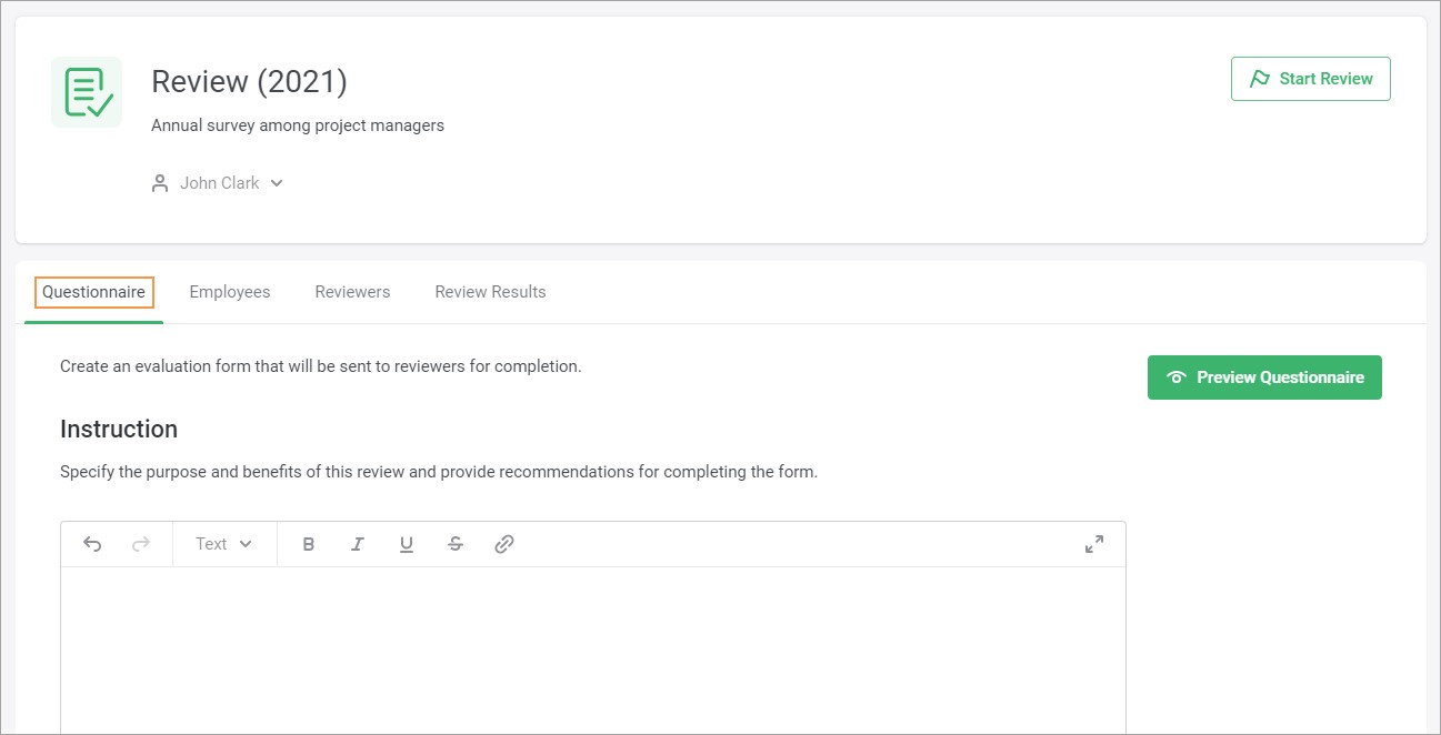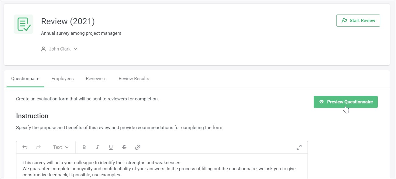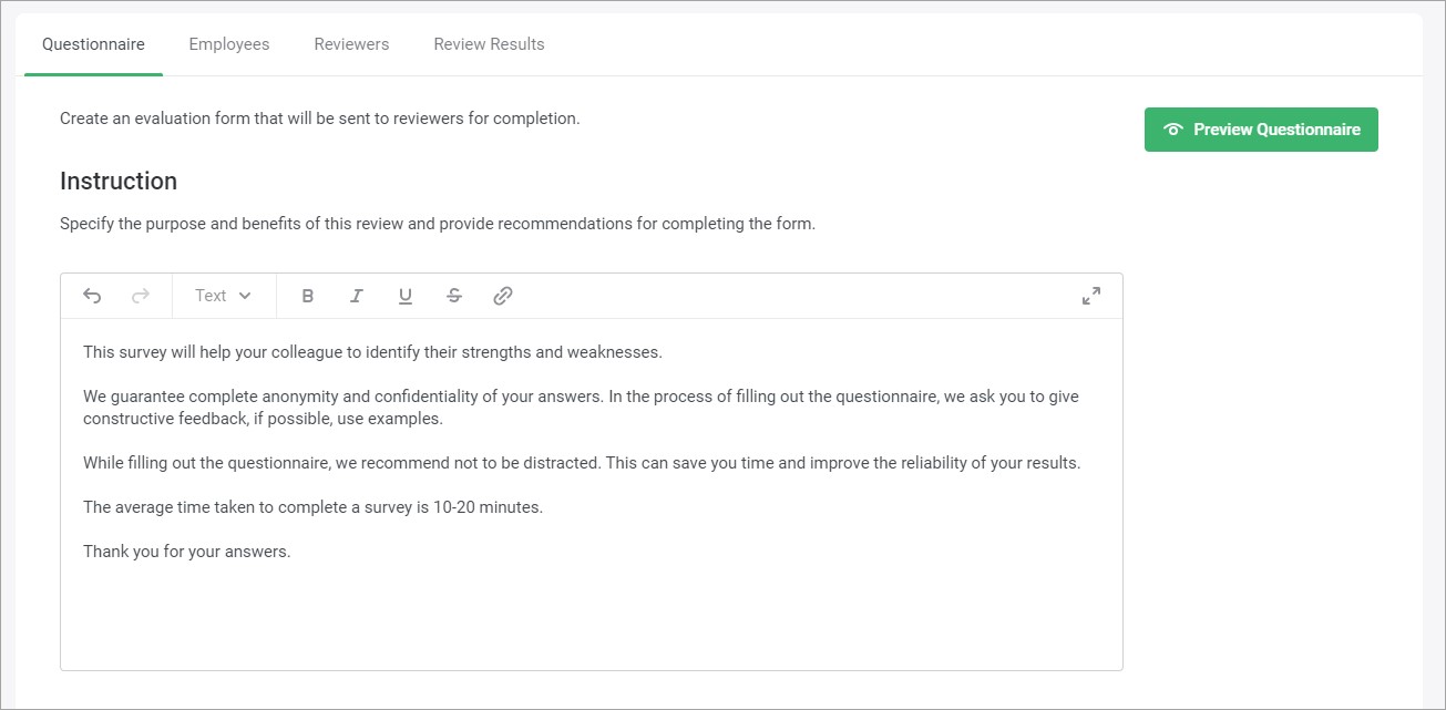 Before sending the questionnaire to the reviewers, check to see what it looks like.