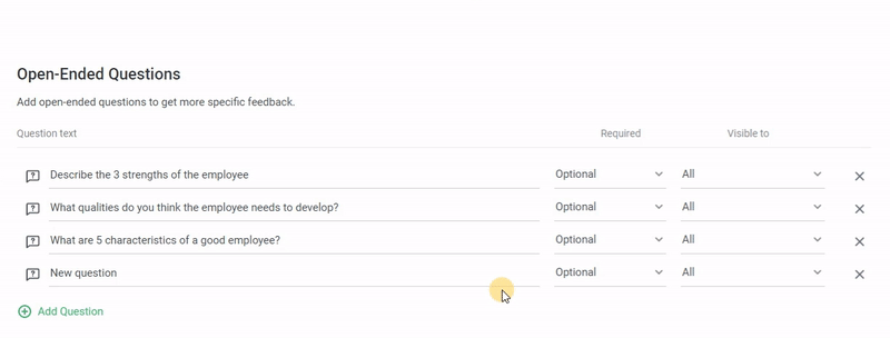 - In the Open-Ended Questions section, write questions for reviewers to get detailed feedback on the employee. Select whether the question is required or optional and customize who can see them. Then change the order of the questions.