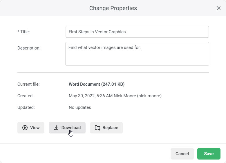 iSpring Learn Learning Content Courses Managing Courses Actions with Modules Current: Downloading Modules Downloading Modules Feel free to download files of the content items included in the course. To do this, open the editing window and click Download. The file is downloaded to your computer. The file download is available only for PowerPoint (.ppt, .pptx) presentations, Word (.doc, .docx), Excel (.xsl, .xslx), and PDF documents. ×
