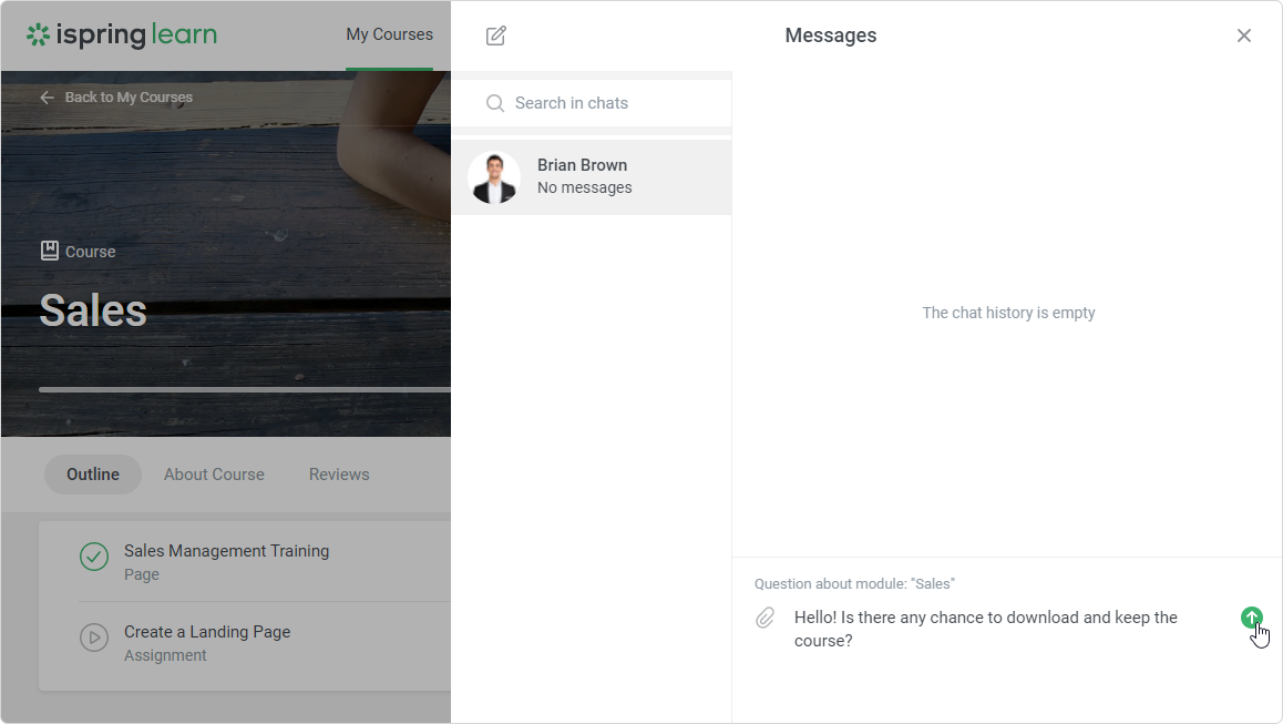 iSpring Learn Users Instructors Current: Exchanging Messages with Instructor Exchanging Messages with Instructor Users can send messages to instructors and receive feedback from them. To contact an instructor, click the Contact instructor link. Make sure that private messaging is enabled in the User Portal Settings. On the Messages page, type your message for the instructor and send it.The instructor will see a notification about a new message in their account. If the instructor is deleted from the content item, removed from the account, or deactivated, the correspondence history will also remain.If a question has been asked through the Questions and Answers tab, the instructor will see a notification in their account. ×