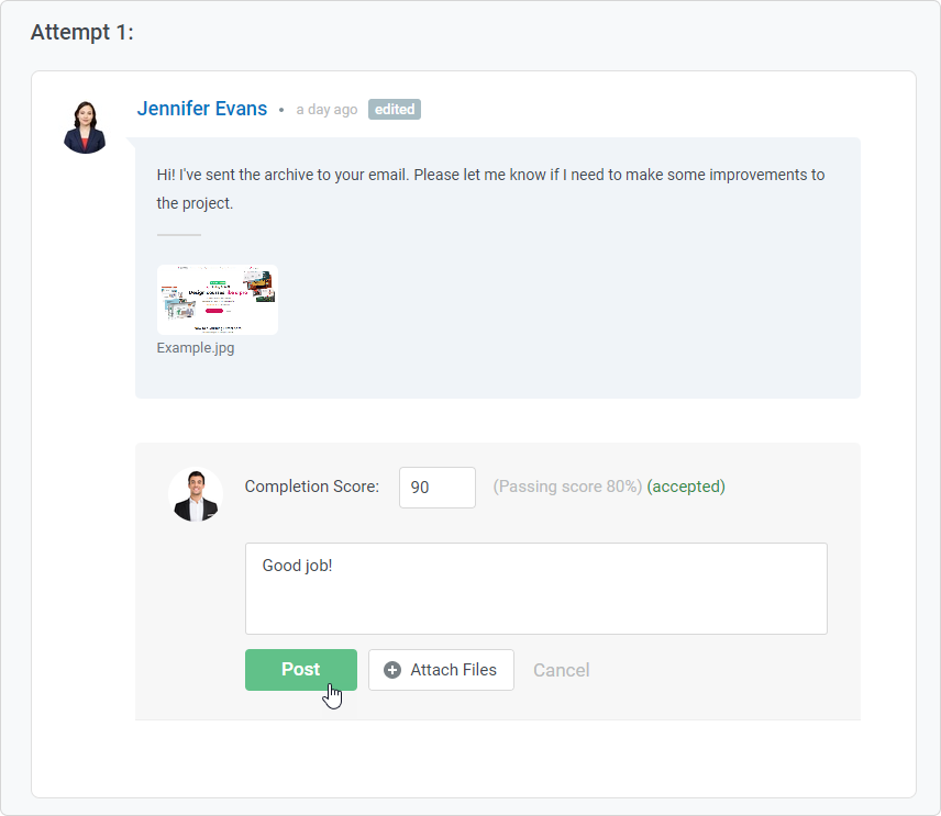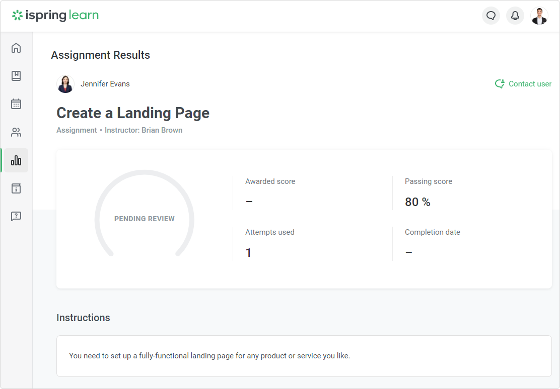If the completion score is equal to the passing score or higher, the assignment will be accepted; if not - declined. Users can see their score on the assignment page.