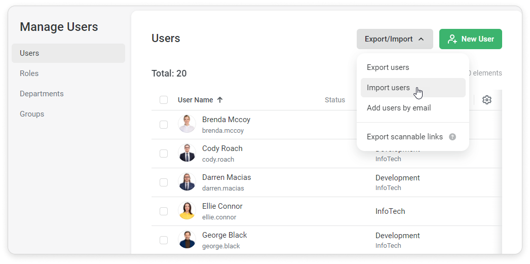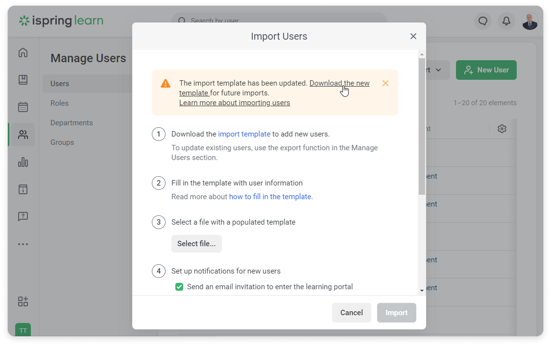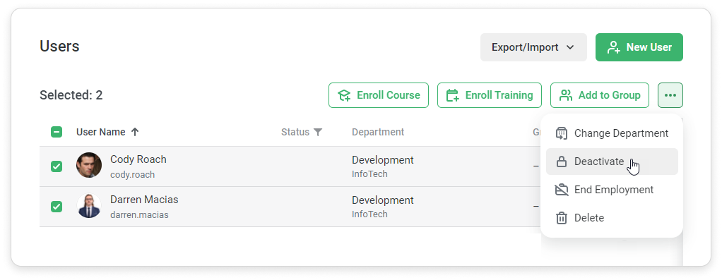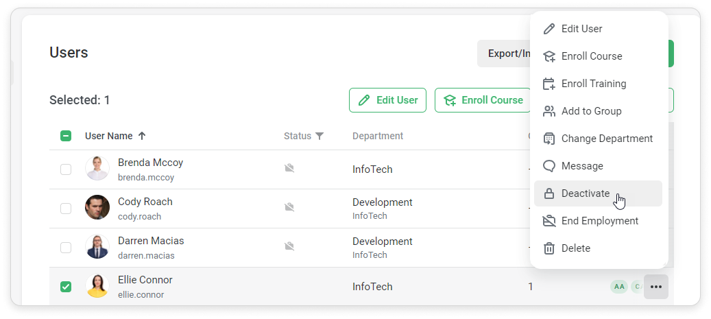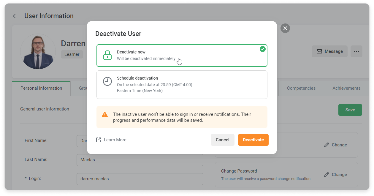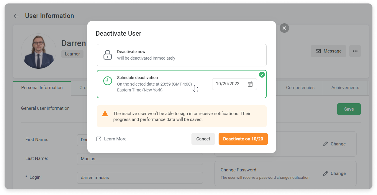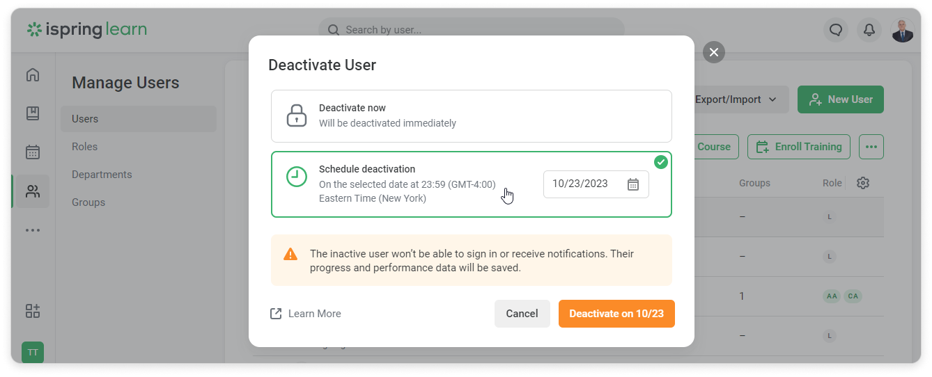 iSpring Learn Users Managing Users Editing Users Current: How to Deactivate a User How to Deactivate a User Here are some ways to deactivate users:In the User Information CardGo to the Personal Information tab.Click on Change next to the user status and select Deactivate.Select Deactivate now, if you want a user to be deactivated immediately.Click on Schedule deactivation to select the date when the user will be deactivated.Define the date when this user will be deactivated.Click Deactivate.You can also cancel scheduled deactivation.In the Users ListChoose one or multiple users in the Users section. Select Deactivate.Or you can click on "..." → Deactivate.Select Deactivate now, if you want a user to be deactivated immediately.Click on Schedule deactivation to select the date when the user will be deactivated.Click Deactivate.In the Excel fileClick on Export/Import in the Users section and select Import users.Download the import template.Fill in the template with user information and change the user status to "Inactive" in the Status column.Select a file with a populated template.Finally, click on Import.Confirm that you would like to update your users list.Via APIUsers will change their status to "Inactive" and won't be able to sign in or receive notifications. ×