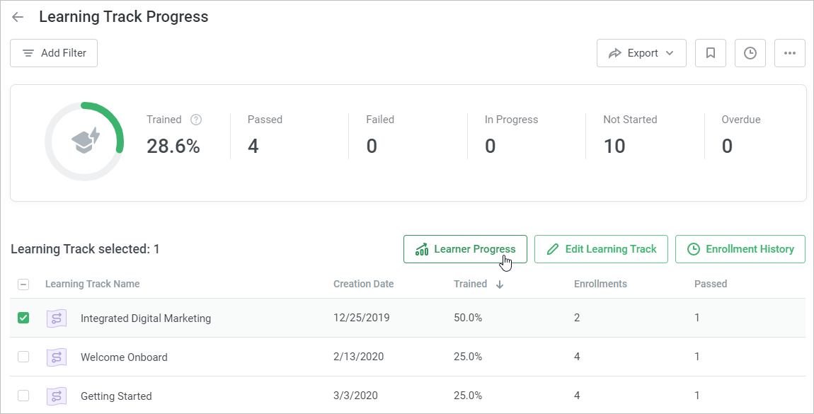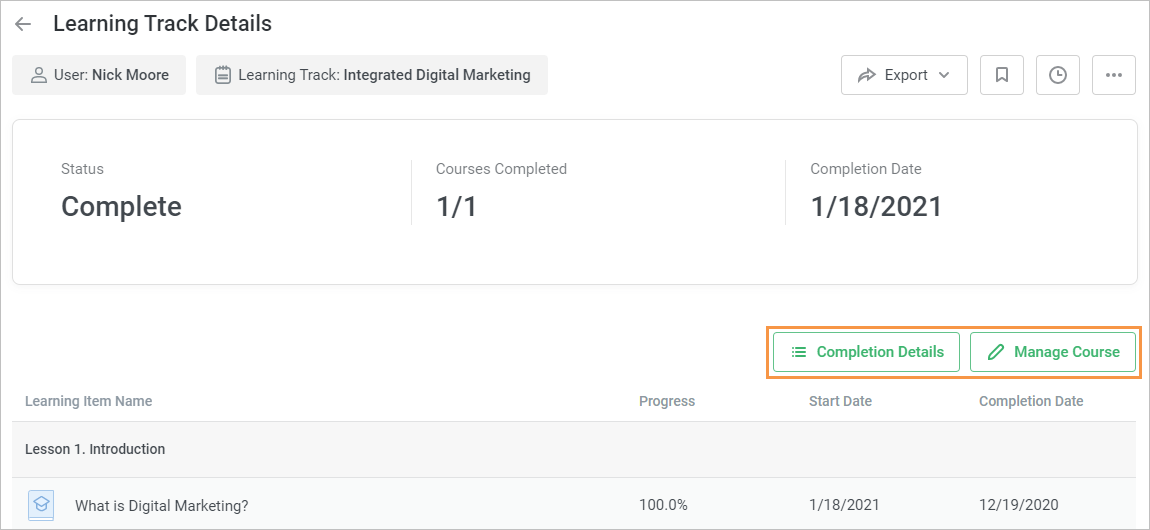 | Completion Date | The learning track completion date. If the learning track hasn't been completed yet, a dash will appear. |