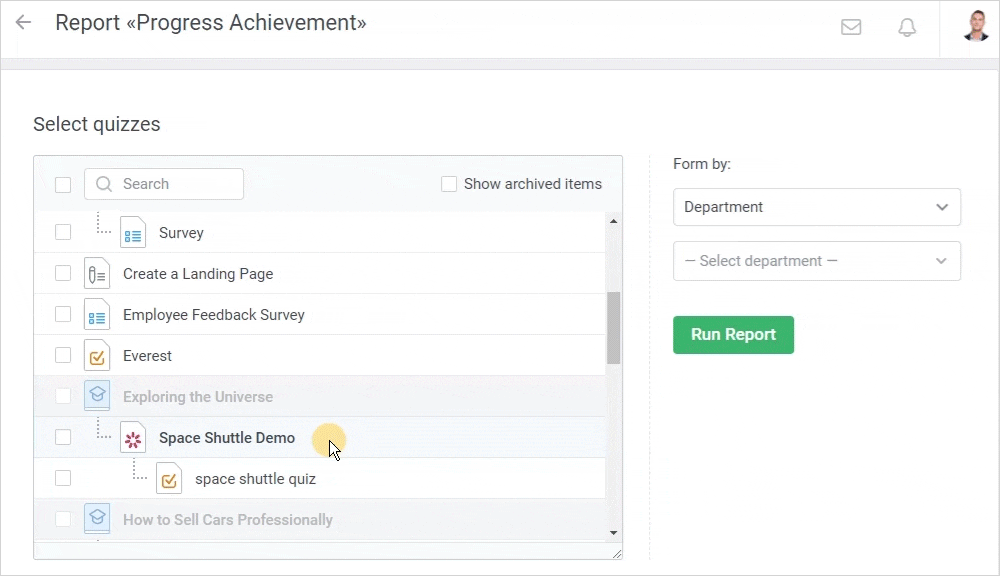 Select modules and a department/group you would like to run a report on. Then, clickRun Report.
