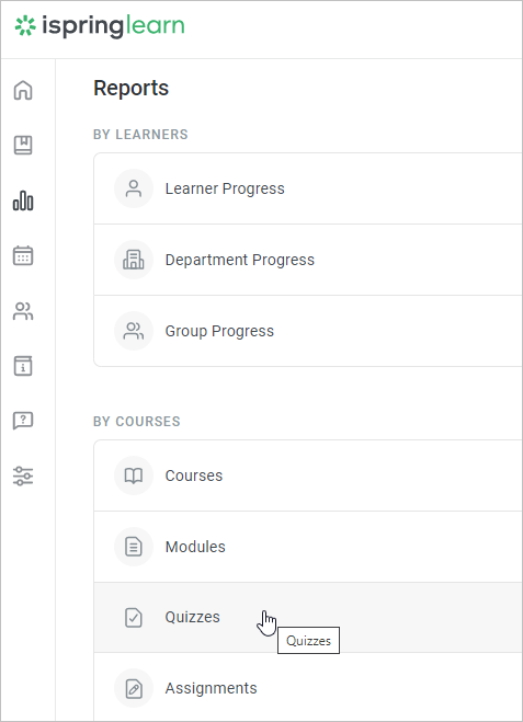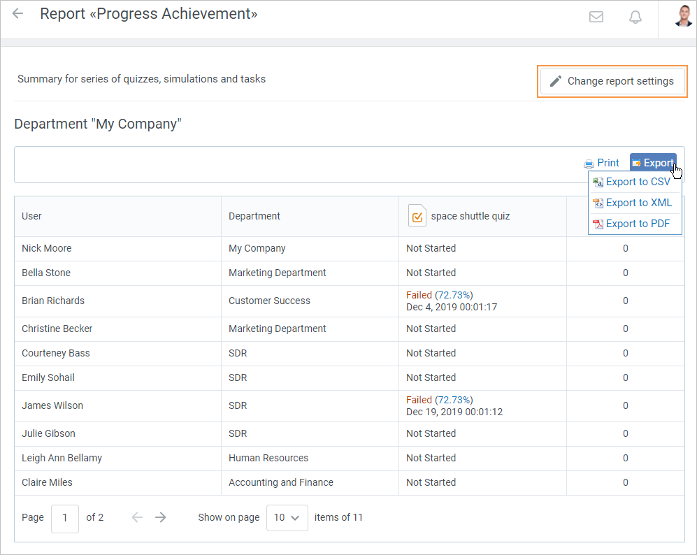 This kind of report allows you to view how users progress through the modules included in the course: quizzes, dialog simulations, surveys, and assignments.